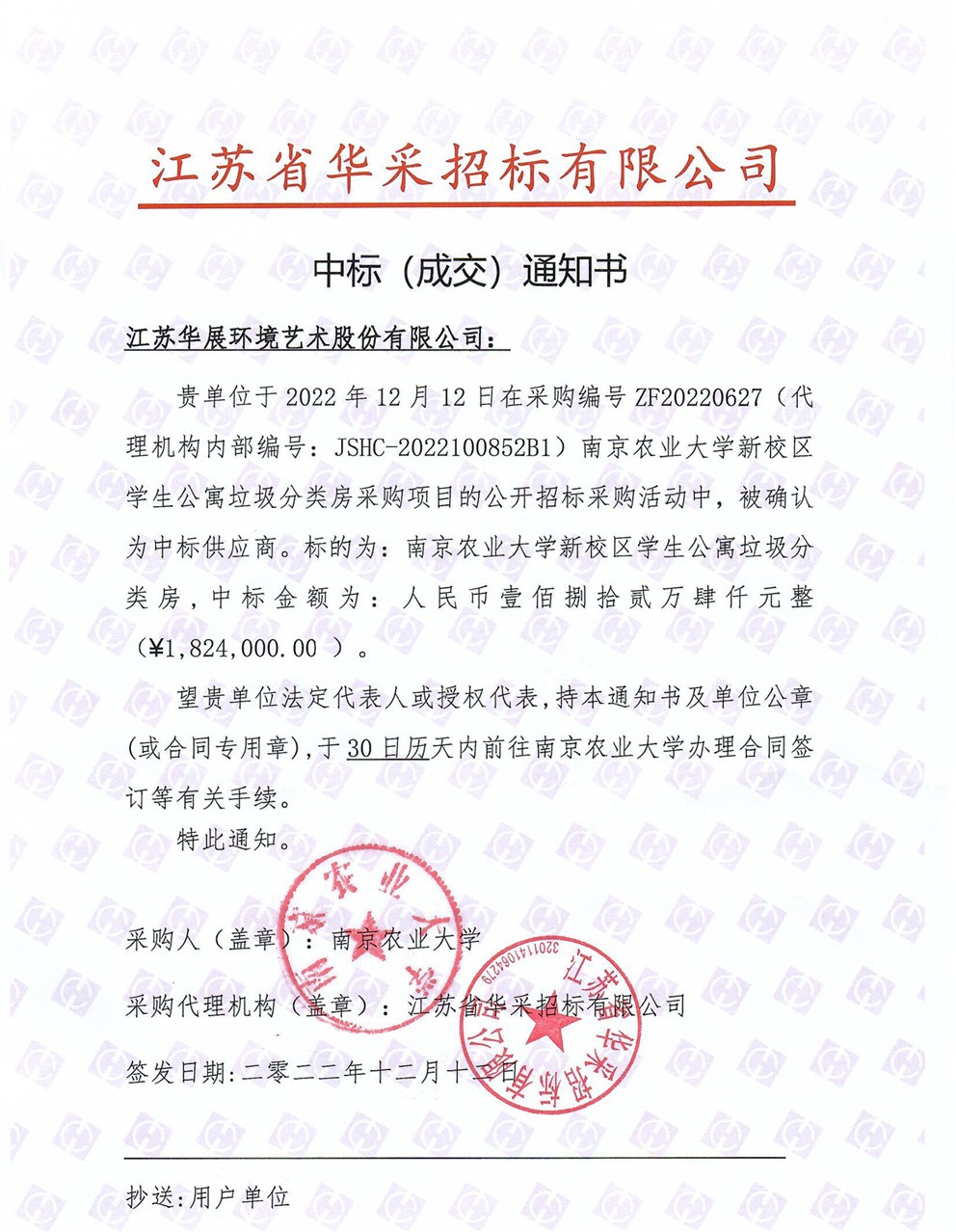【中標(biāo)通知】南京農(nóng)業(yè)大學(xué)新校區(qū)學(xué)生公寓垃圾分類房采購(gòu)項(xiàng)目