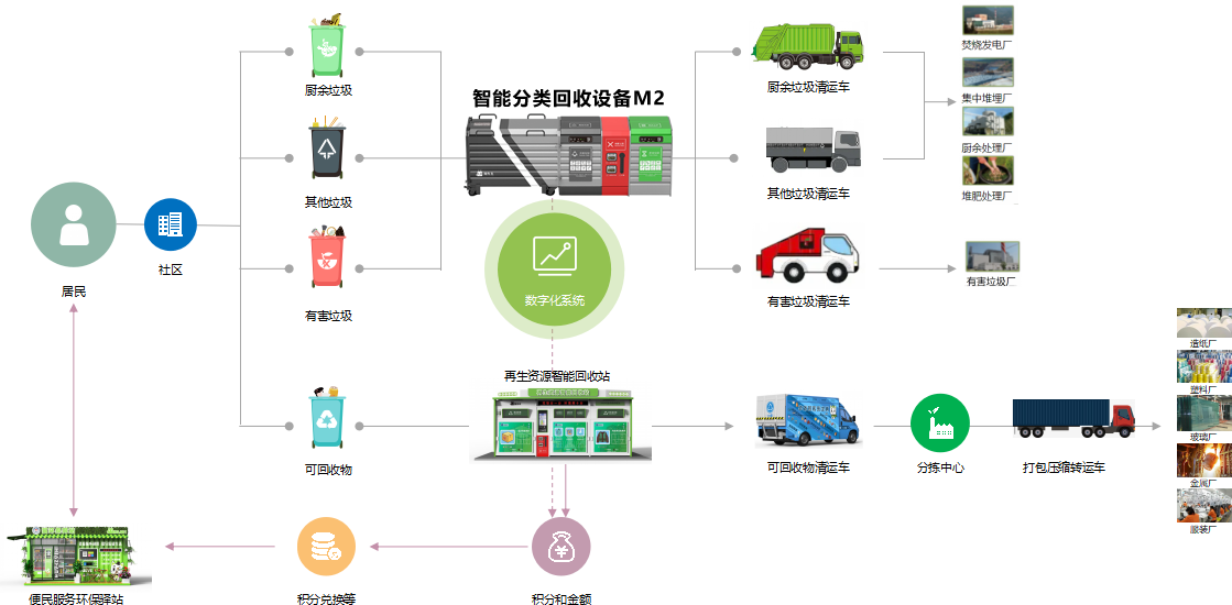 居民、環(huán)衛(wèi)、政府可以通過各個端口的APP對區(qū)域內(nèi)的垃圾分類進行互動、清運回收、監(jiān)管